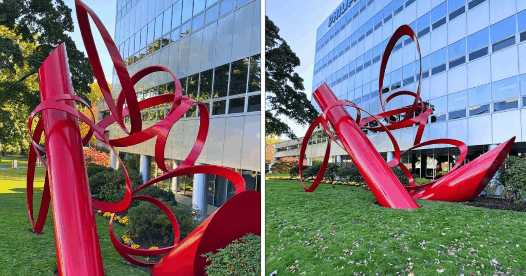 Created by renowned artist Alexander Liberman, Thrust is an abstract sculpture composed of dynamic red tubular forms that seem to propel forward (hence the name). Liberman’s works often combine industrial materials with a sense of fluid movement, turning steel and paint into poetry in motion.